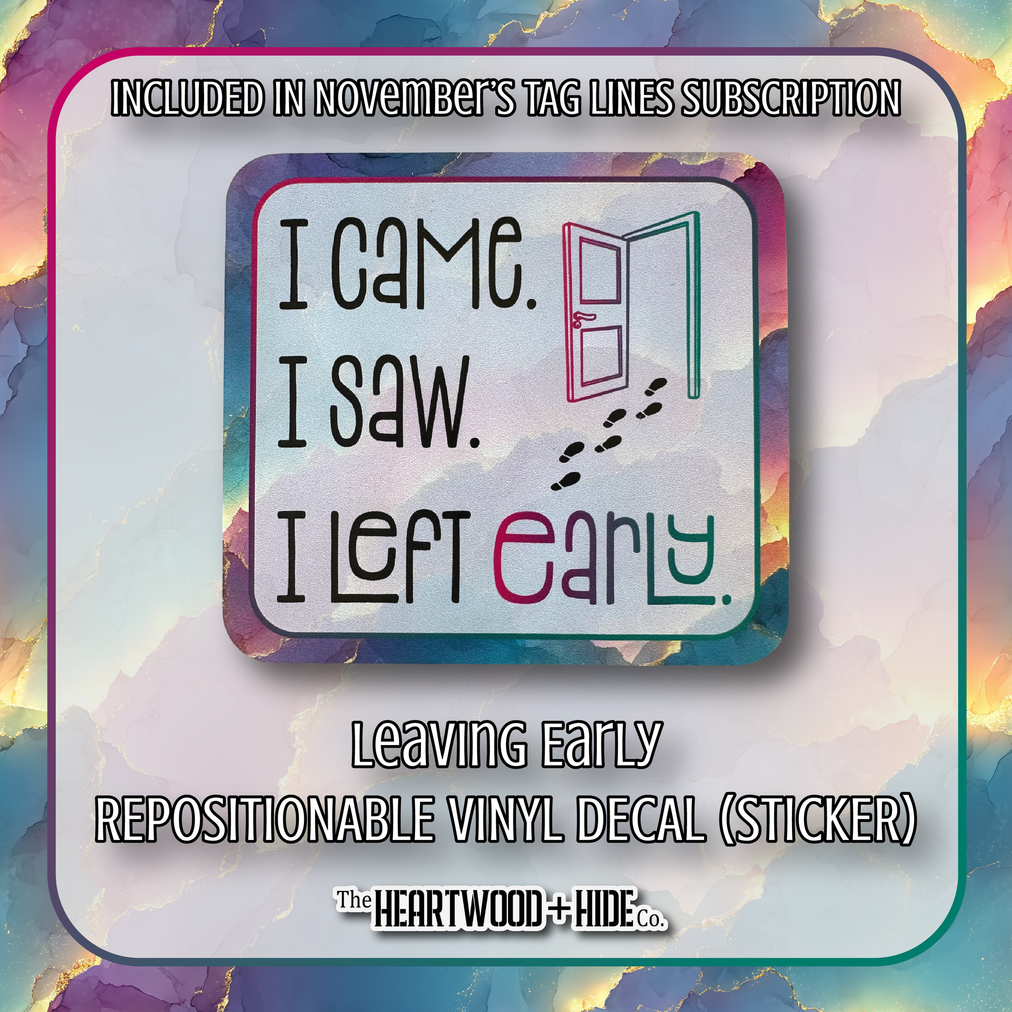 ![Load image into Gallery viewer, "Leaving Early" - Repositionable Vinyl Decal (Sticker) [TL '25 November]](http://www.heartwoodandhide.com/cdn/shop/files/StickerWatermarked_1ce28733-9a48-4c43-aa30-a1b12211cb87_110x110@2x.png?v=1763137509)